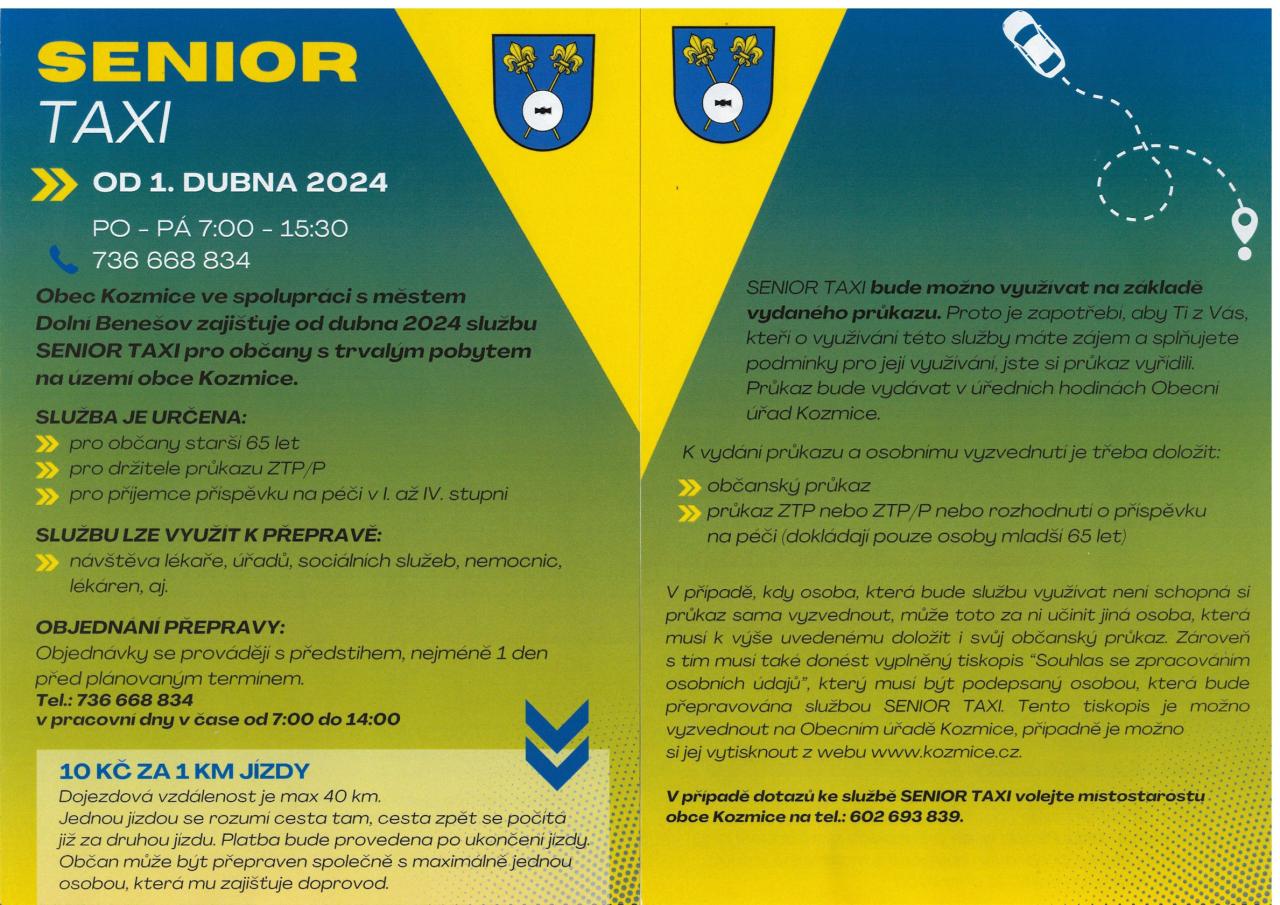 Obec Kozmice ve spolupráci s Městem Dolní Benešov zajištuje od 1. 4. 2024 službu SENIOR TAXI pro občany Kozmic, a to od pondělí do pátku 7.00-15.30 hod. Ke službě je nutné se registrovat na obecním úřadě. Více informaci podá místostarosta na tel: 602693839.